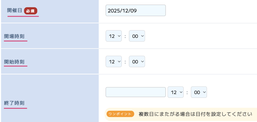 次に設定する項目として、「開場時刻」、「開催時刻」、「終了時刻」を設定しましょう。