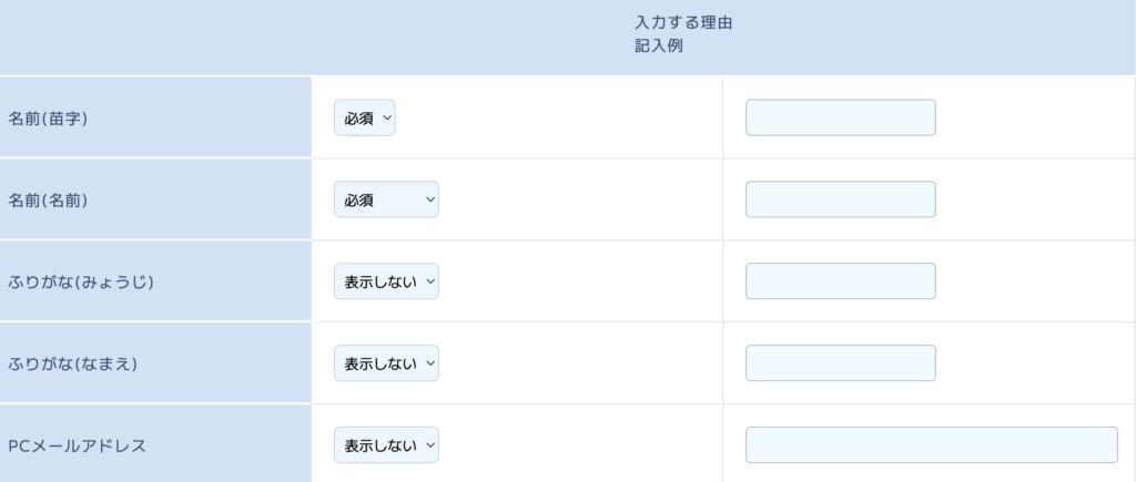 次に、必要な項目を、「必須、表示、非表示」で設定していきます。必須や表示を選択して、理由などを書いておきたい時は、右側の欄に記載しましょう。生年月日や、アメブロID、LINEIDなどを入力してもらう時は、その理由を記載しておくと記載してもらいやすいです。