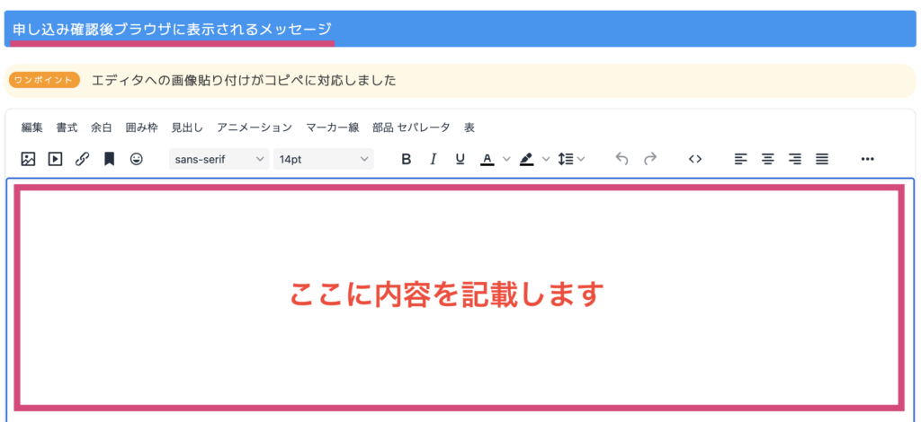 「申し込み確認後ブラウザに表示されるメッセージ」の箇所から、さらに下に申し込み後のメッセージを記載する箇所がありますので、こちらに内容を記載してください。