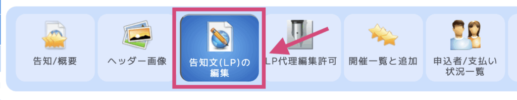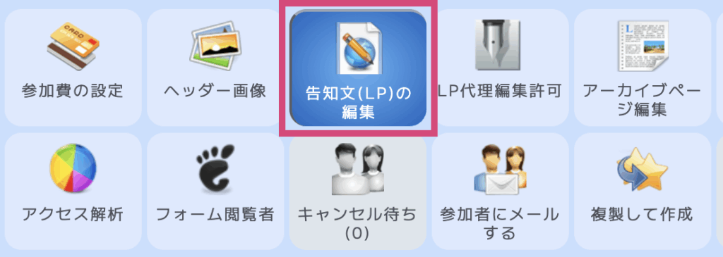 まず、アイコンの中にある「告知文(LP)の編集」をクリックします。