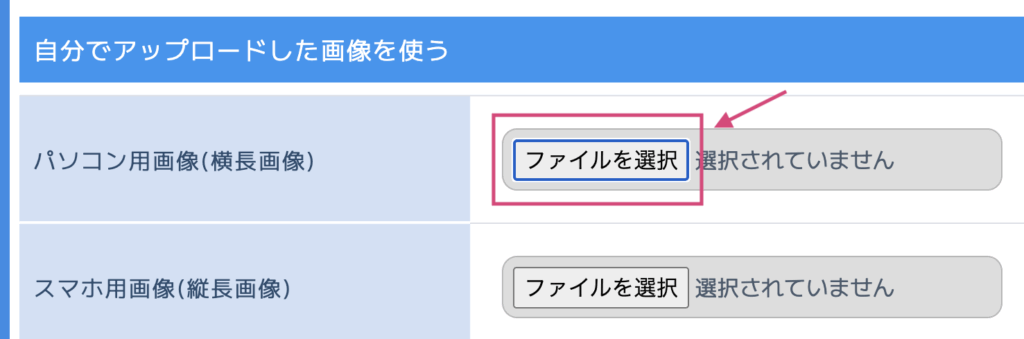 自分で作ったヘッダー画像をイベントのランディングページに表示したい場合は、「自分でアップロードした画像を使う」の箇所から「パソコン用画像」、「スマホ用画像」のどちらかのファイルを選択をクリックします。