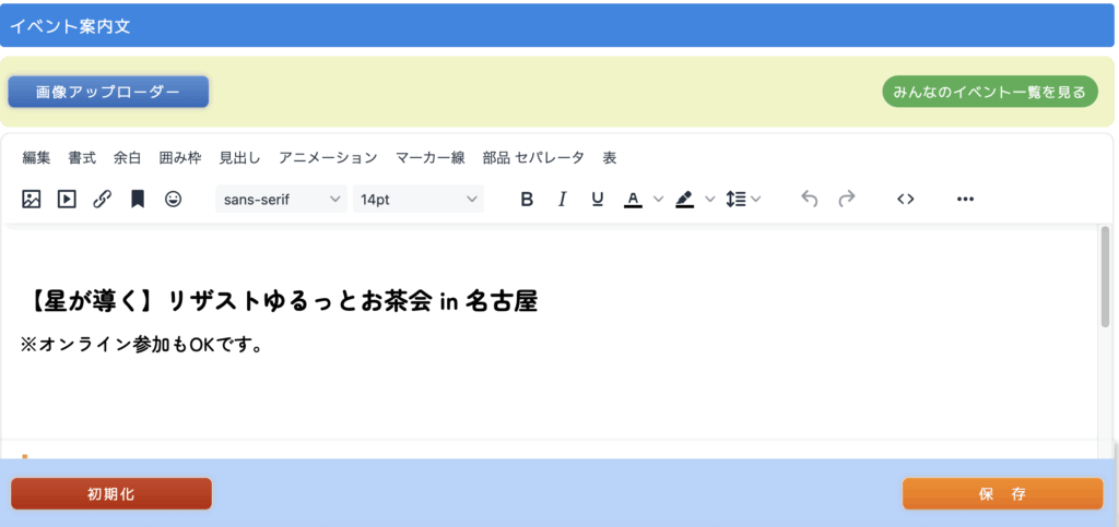 イベント案内文の中には、文字の装飾は、もちろん画像や動画を入れることができます。文字だけだと、読みにくい案内文になってしまいますので、文字の装飾や画像などを入れてイベント参加しやすい形に改良して伝えていきましょう。