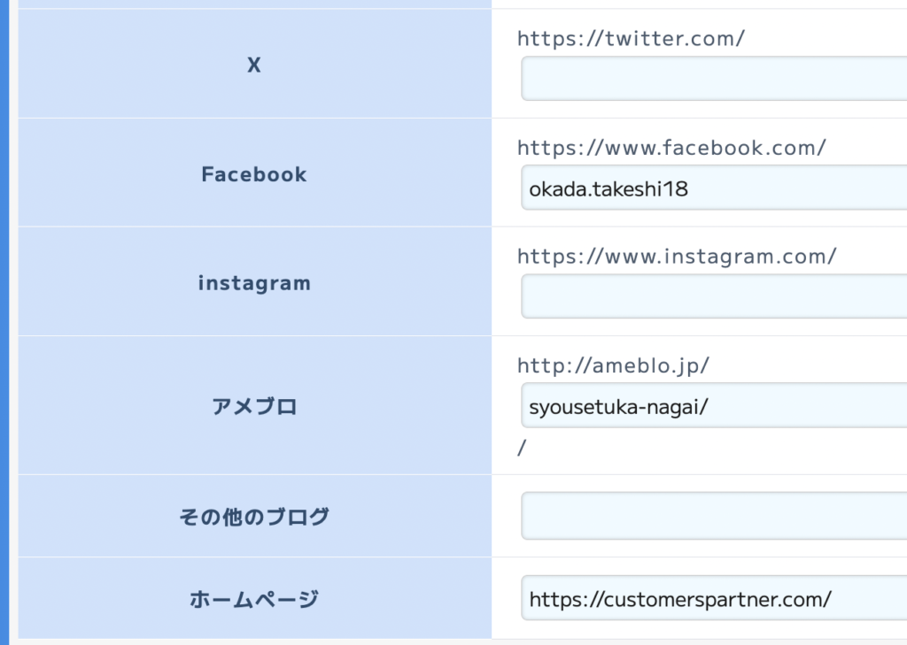 リザストのプロフィール画面のフッター部分に表示されるSNS、ブログ、ホームページなどの項目の設定をしていきます。
